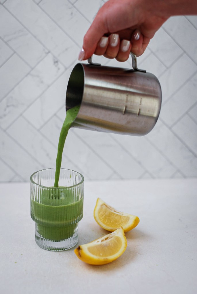 - Add pineapple, ginger, apples, a banana, and lemon juice into the same blender. Blend again until fully smooth.